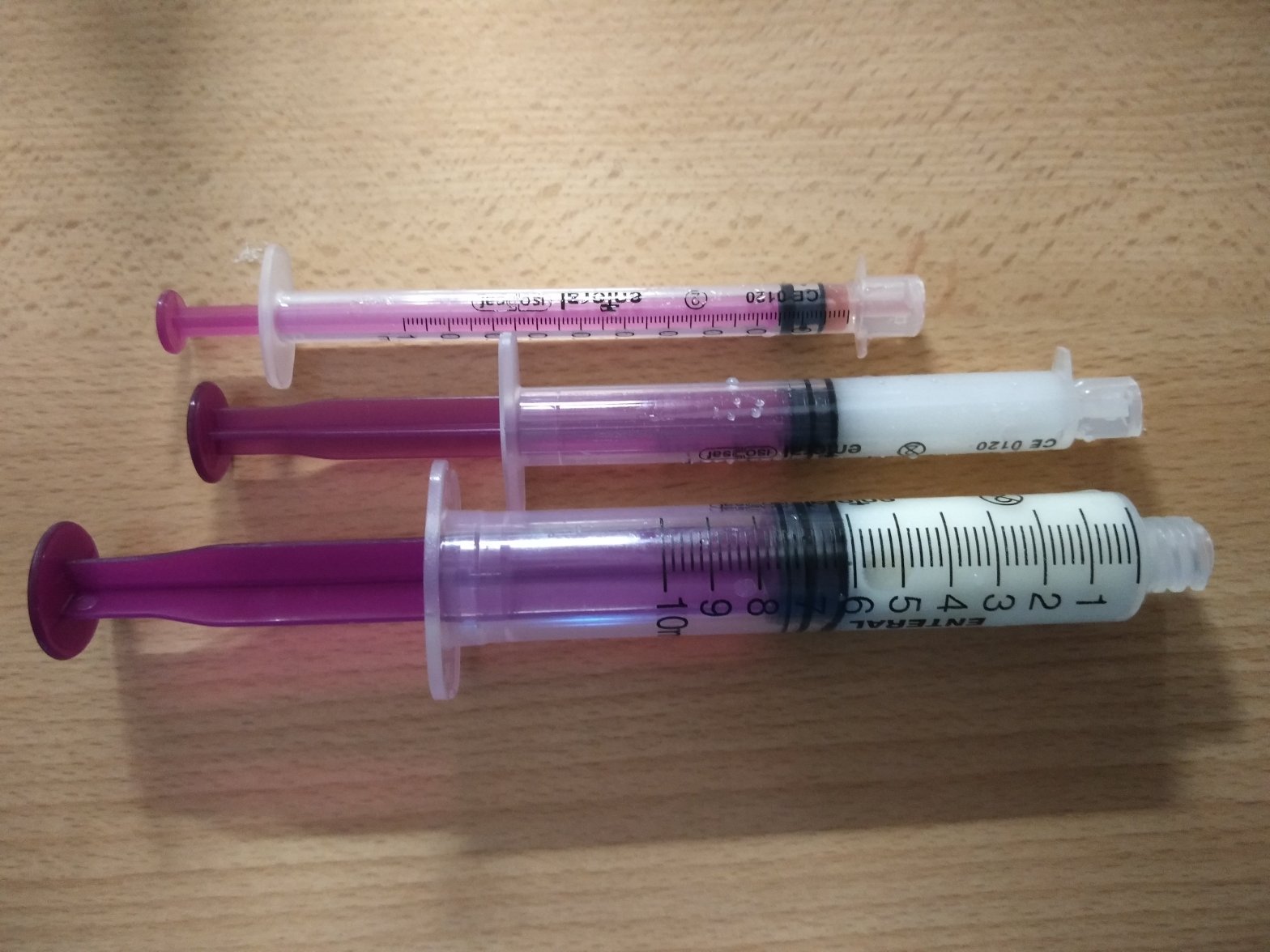 The top syringe pictured is a 1ml syringe in which Clara has 0.08ml of loperamide.