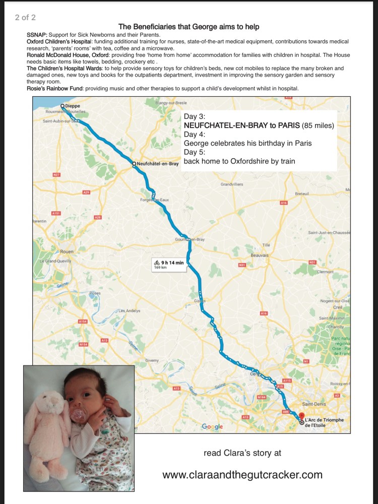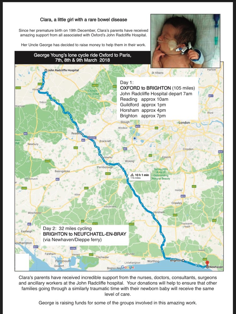 On Wednesday morning George will arrive here at the Children’s Hospital around 6.30am. With the help of a nurse, we’ll take Clara, attached to her tpn fluid stands, downstairs to wave George off. 12 hours of cycling later he’ll arrive in Brighton at night and he’ll catch a ferry from Newhaven the next day.