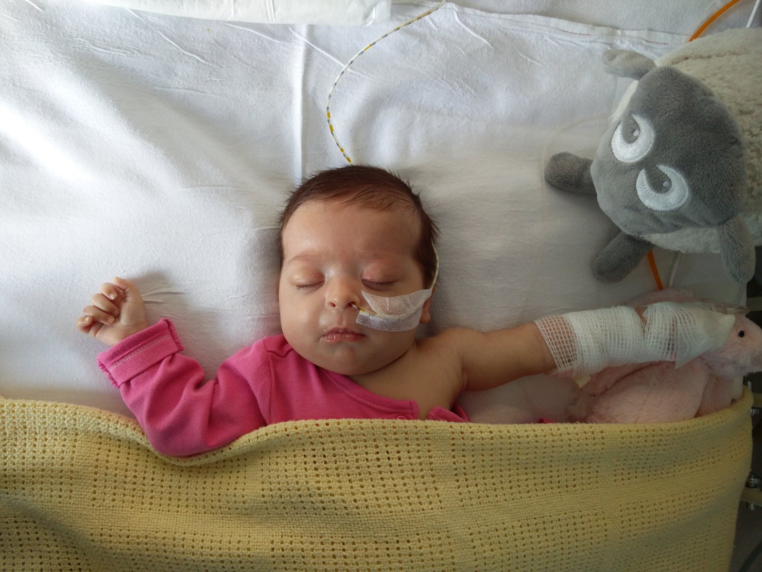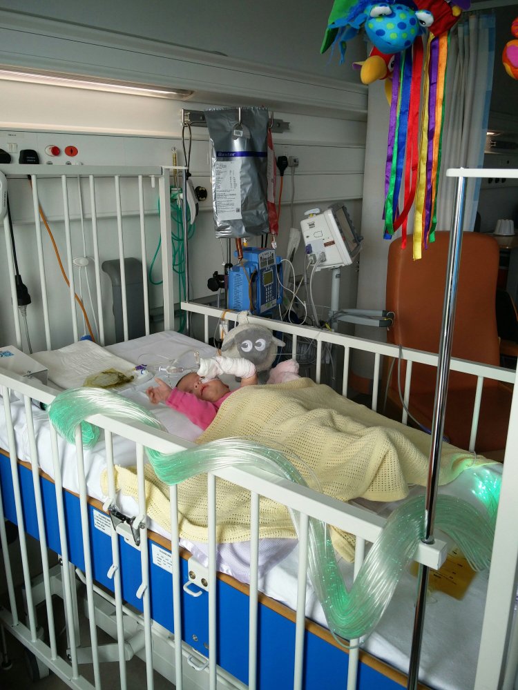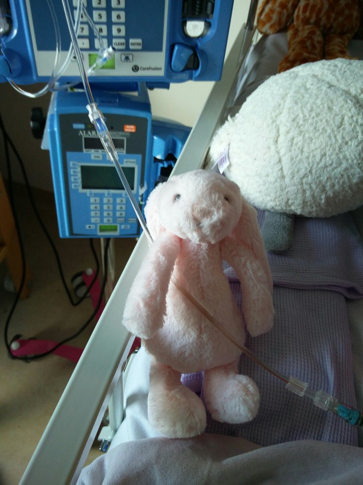 Unfortunately, the fluids were going through at a slower rate than her blood flow. So when I picked her up, gravity kicked in and her blood would flow from the main vein (that goes directly into her heart) down her hickman line instead, and into the fluid pipe. Sadly, this meant I couldn’t pick her up at all. So I hooked her pipe onto another hook on the fluid stand so it stayed above her heart level, and used Clara’s bunny Penny to keep the fluid pipe in place. It was upsetting I couldn’t cuddle Clara before such a huge operation, but I couldn’t risk her safety.