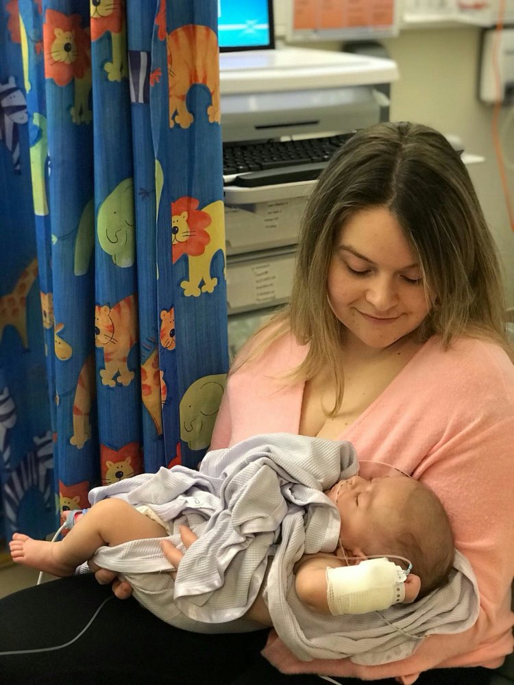 Dean and I went to recovery to collect Clara. As we walked in, Clara was there in the first bay in the arms of a recovery nurse dressed in scrubs with a friendly smile. She said “Hello mum, let me pass you your baby.” All of the previous times I’ve been to recovery to get Clara, she’d been laying in her cot wrapped up in medical blankets, so to be handed her straight into my arms was wonderful. We stayed in recovery for what felt like half an hour as they prepared to return Clara to the ward, handing over to our ward nurse Emma all of the details of Clara’s observations and care requirements.