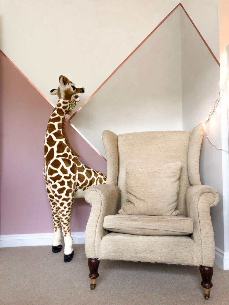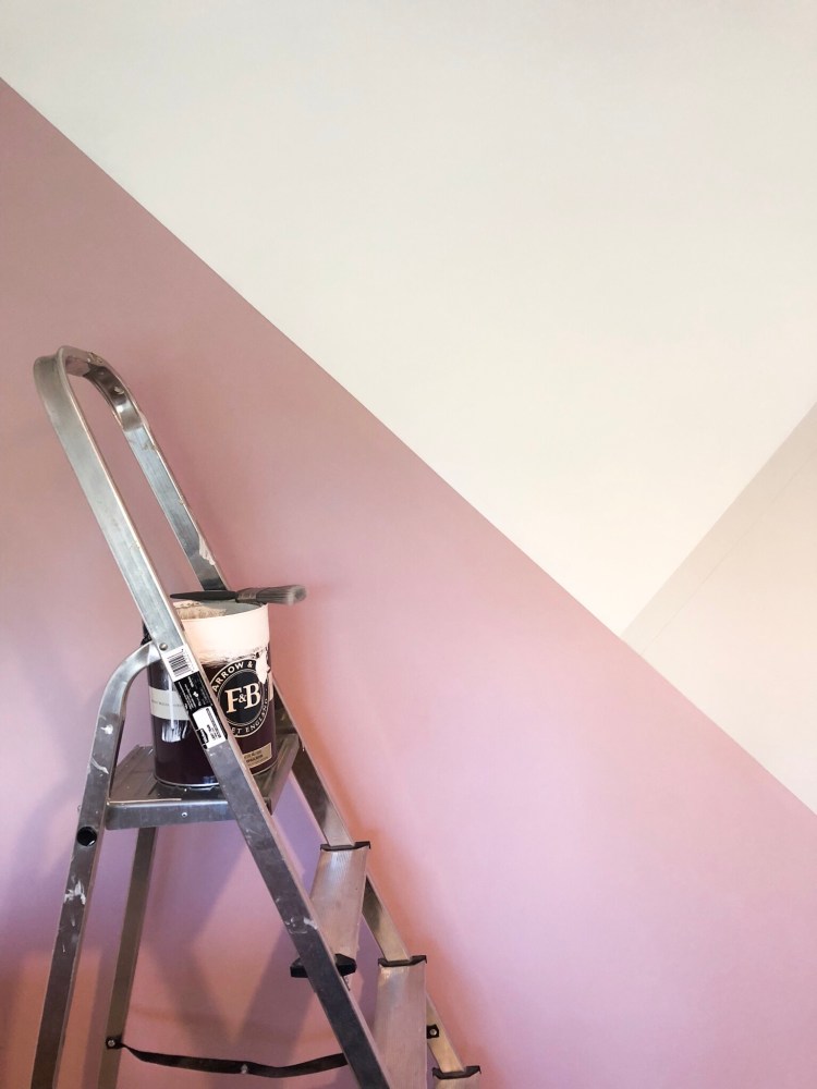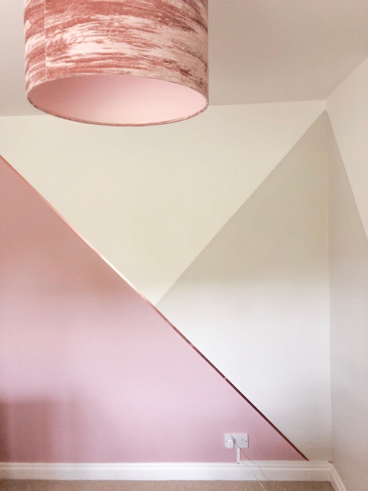 4. Using a pencil and a spirit level, draw your lines on the wall. I didn’t want three exact triangles so we specifically didn’t do ours corner to corner. I knew I wanted the feature colour to be the dusky rose pink, and I wanted to have grey and white in almost equal proportion. The benefit to using a pencil is you can keep drawing until you get it right – just make it clear which your final chosen set of lines are! Stand back, look, take a photo, review, and tweak if need be.