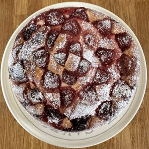 Cover the batter in the cake pan with the diced strawberries. There should be enough to lightly cover the surface of batter.